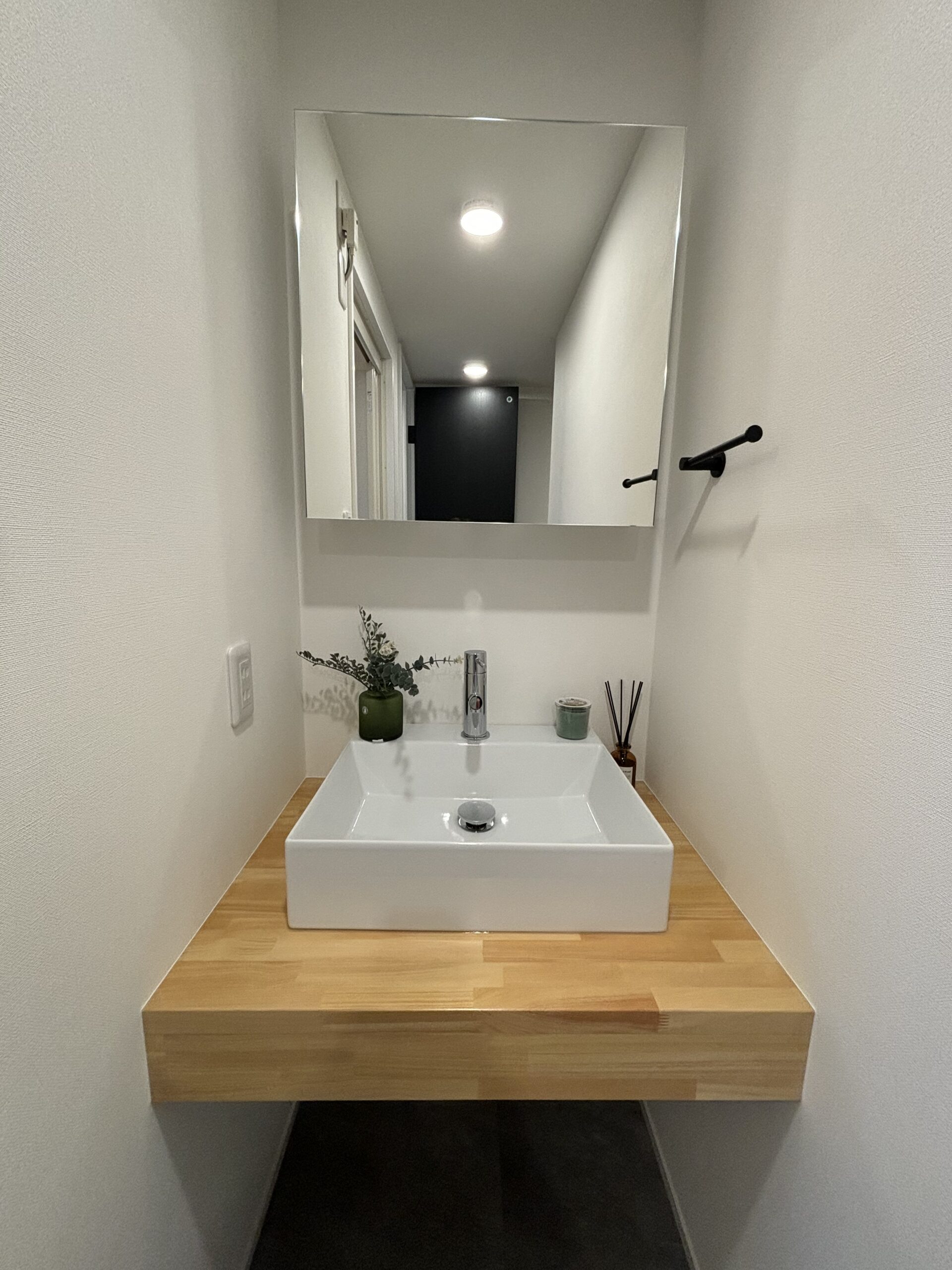 床は秋田産の杉材フローリングで玄関を開けると杉の香りが広がります。和室のお部屋や廊下・階段含め水廻り以外は国産杉のフローリングに。洗面は木製の造作に。前には遮る物も無く視界も良好で、明かりもたっぷり室内に注ぎ込む気持ちのよい住まいになりました。