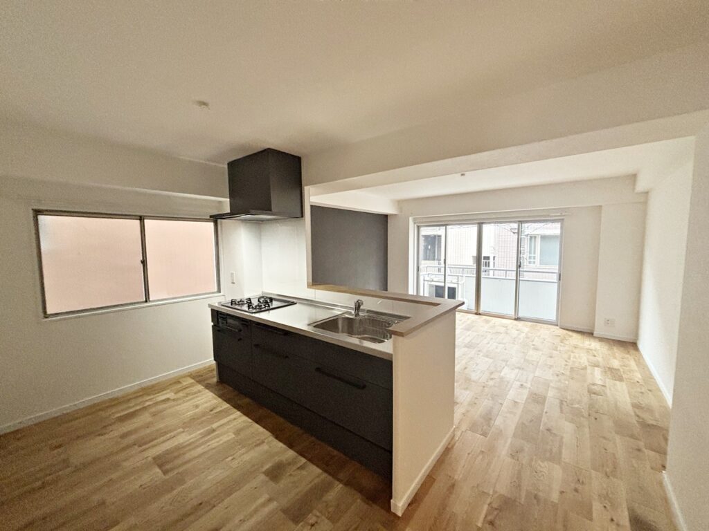 水廻り以外の床はオークの無垢材フローリングに。キッチンを対面にしたLDKは収納をあえて設置せず広々と快適な空間になっています。オークにも合うグレーブラウンのアクセント壁も。