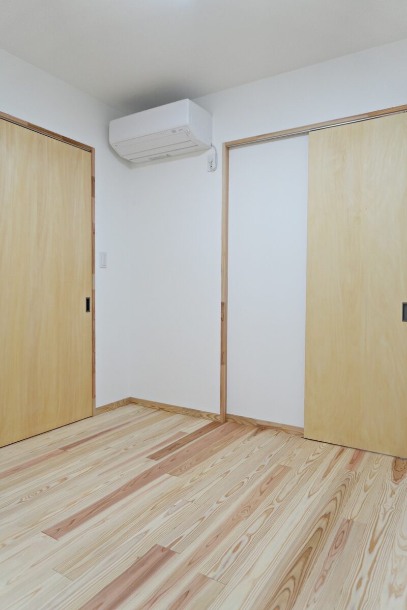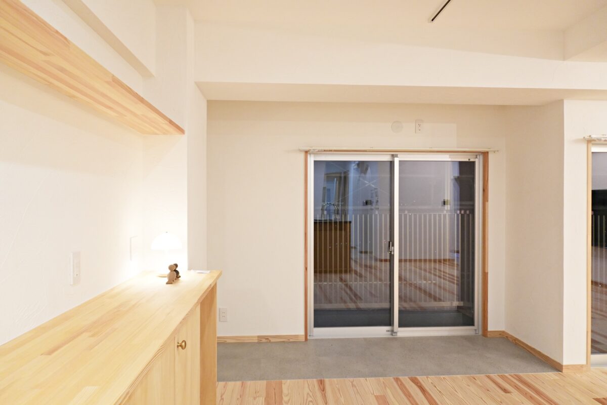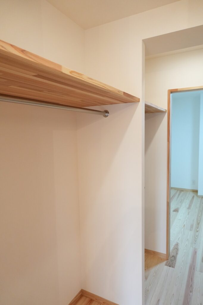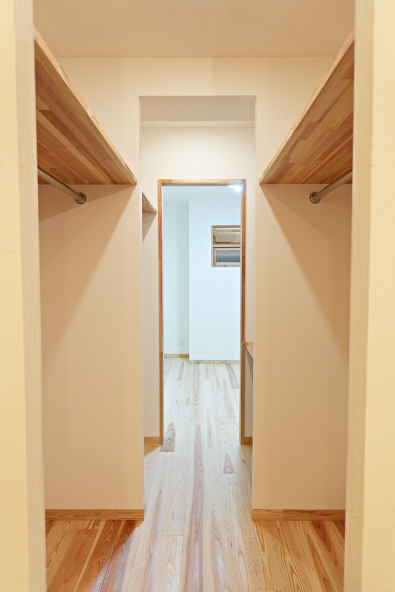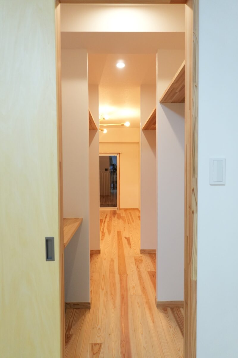 北側に位置する寝室は外の通路を通る人の足音や話声が気にならない様に、玄関土間を設けて少し空間を空けました。光を入れる為に造作窓も設置しました。寝室からリビングの通路となる箇所に大容量のウォーキングクローゼットを造作。洋服な家財道具、また少し奥行きがあるスペースも設置し布団も仕舞える様になっています。