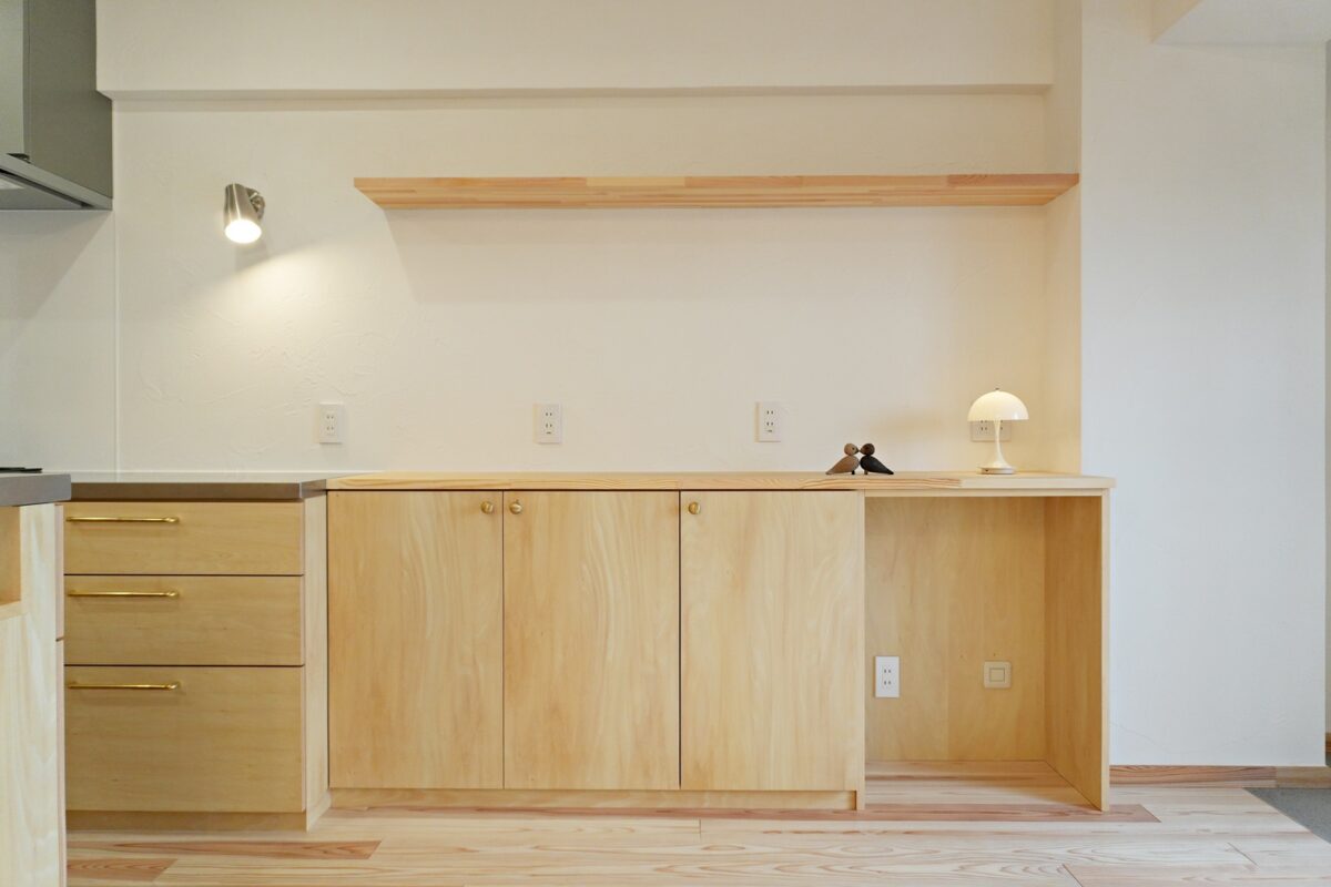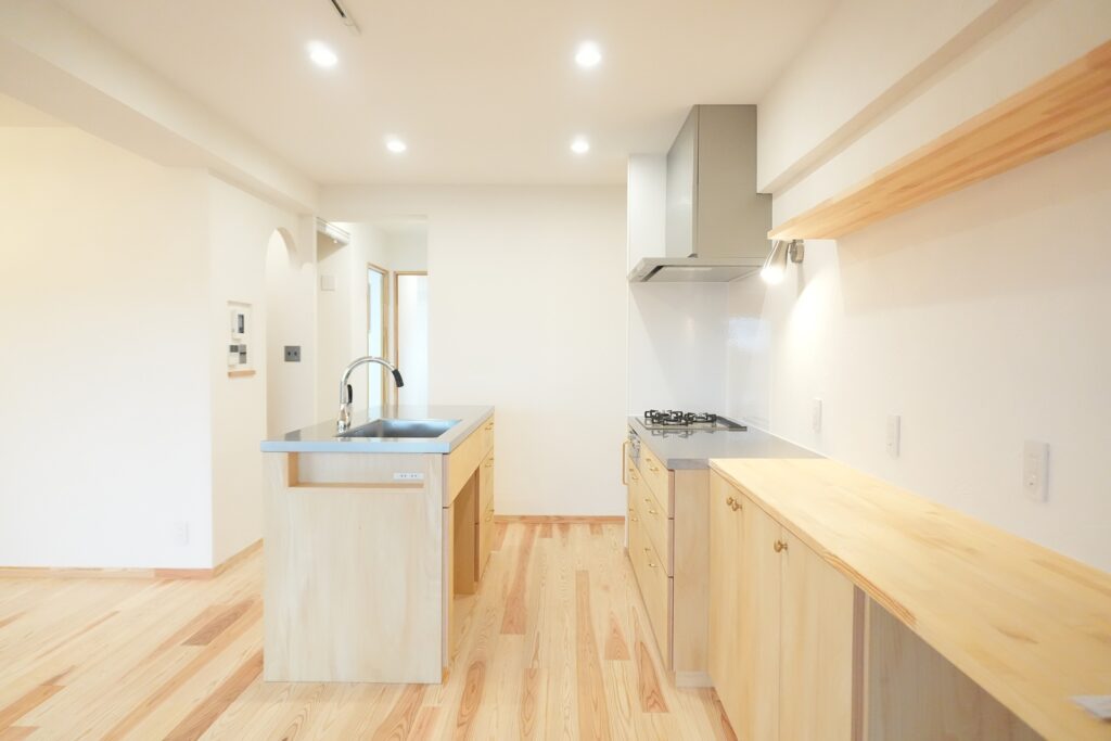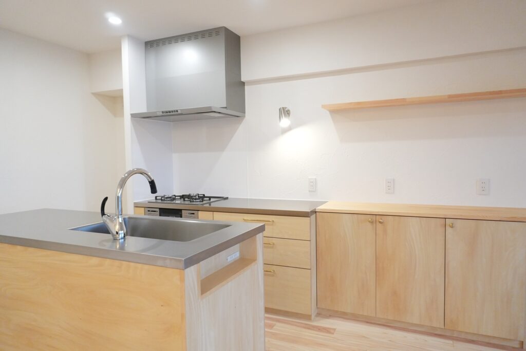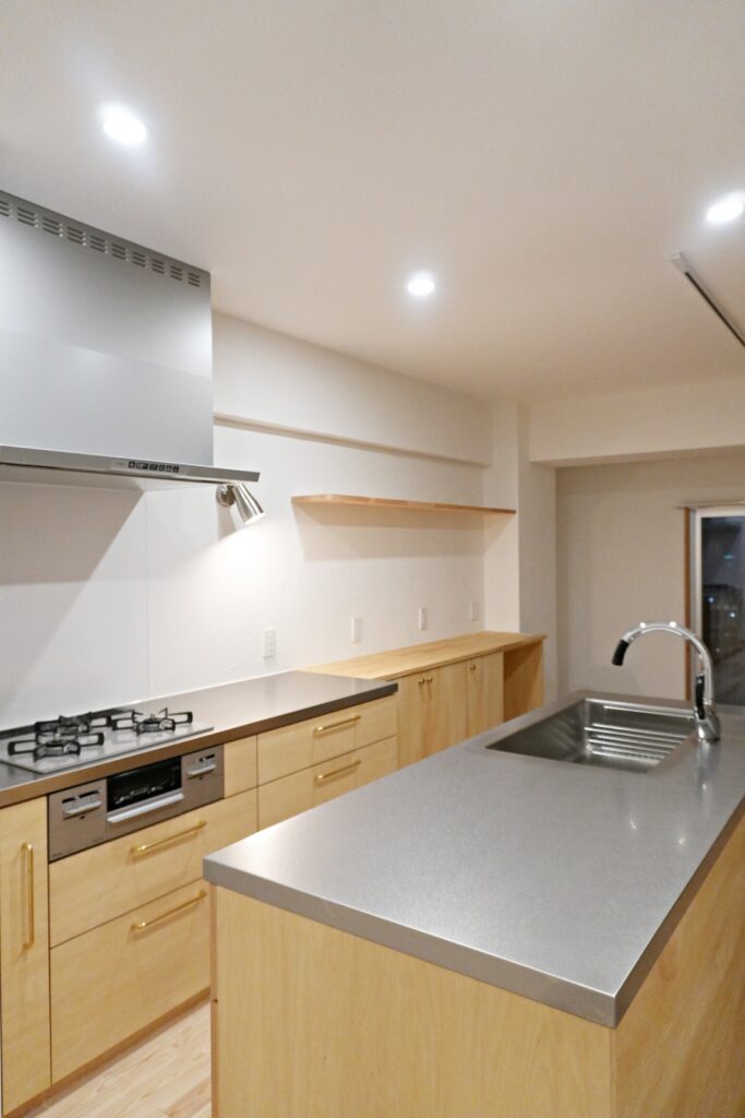 キッチンはシナ材とステンレスの造作キッチンに。合わせて収納棚も造作しました。2例になったキッチンは回遊式となっており、スムーズに作業が出来ます。また、パントリーや洗濯機も近くに設置し家事動線がとても便利になりました。