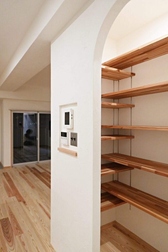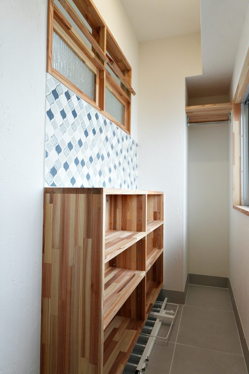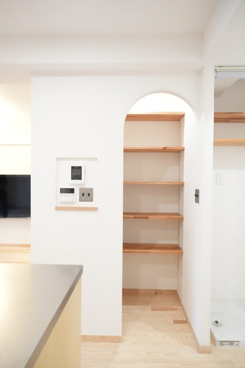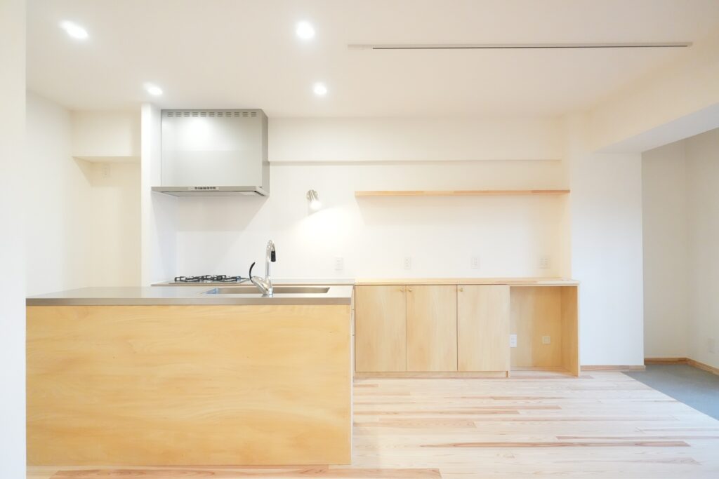 キッチンはシナ材とステンレスの造作キッチンに。合わせて収納棚も造作しました。2例になったキッチンは回遊式となっており、スムーズに作業が出来ます。また、パントリーや洗濯機も近くに設置し家事動線がとても便利になりました。