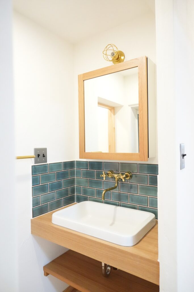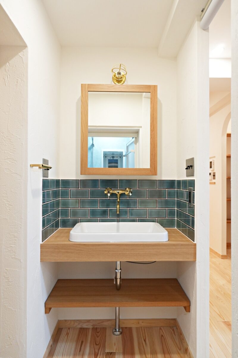 洗面も造作に。緑のタイルがとても素敵です。シンプルなスタイルですっきりとしていります。お風呂も広々として掃除のしやすいユニットバスに。トイレも節水タイプのものに。寝室と外の間には玄関土間を造作。靴はもちろん、コートや外で使用する荷物等を収納出来ます。